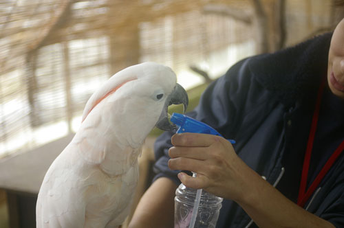 オオバタンのオオちゃん。スプレーボトルから直接お水飲む