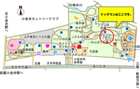 会場小金井公園の地図です(赤い丸が集合場所)