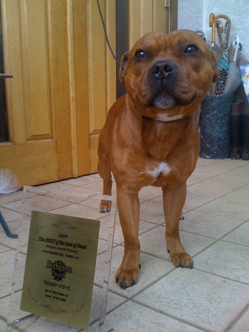 授賞式とか縁がないだろうな〜なんて思ってたけどジンジャーがスタッフォードシャー・ブルテリア♂で、ペディグリーアワード受賞しちゃったからね、もらってきました。